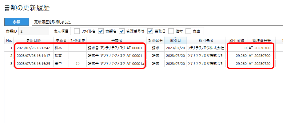 書庫への取引データの登録や登録後の検索データの変更など、いつ・誰が・何を行ったか書類単位ですべてシステム上に記録が残ります。 履歴は製品画面上でいつでも参照可能です。