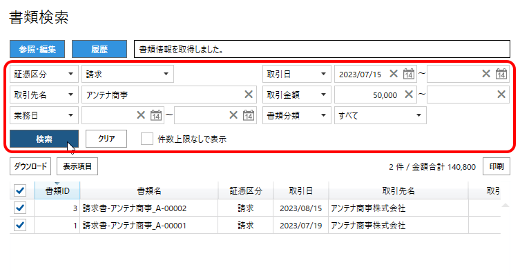 閲覧権限を付与された書庫に登録された電子取引データの検索ができます。