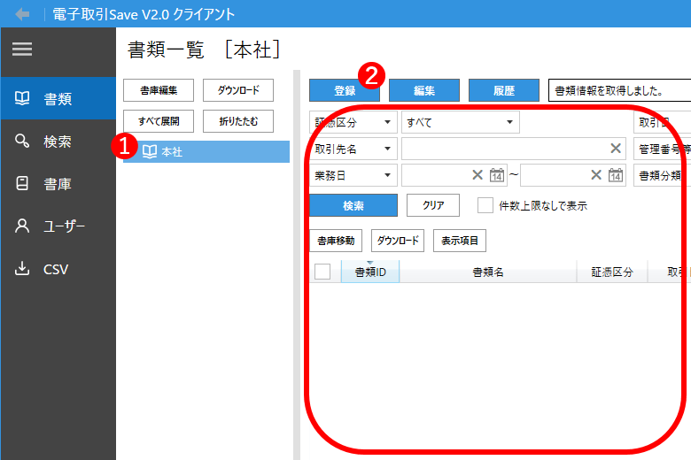 書類一覧の画面で次の操作で取引データを保存する書庫を選択、取引データを読み込みます。
