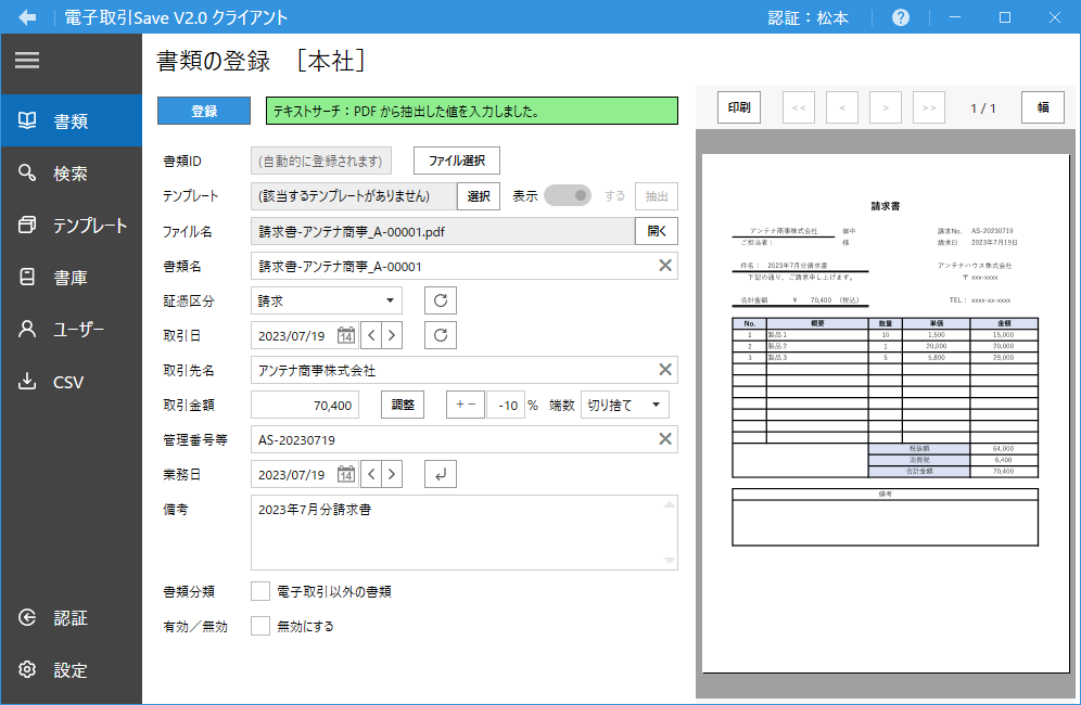 「書類の登録」画面で取引先名、取引金額などの情報を入力後に「登録」ボタンで書庫に取引データが登録されます。