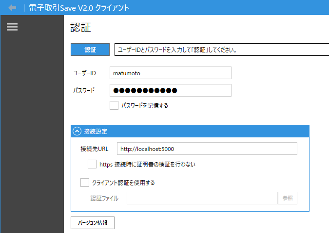 https接続ではサーバー証明書が必要になりますが、自己証明書で接続する場合は「https接続時に証明書の検証を行わない」のチェックをONにする必要があります。https接続、サーバー証明書について詳しくは「電子取引Save サーバー・アプリケーションマニュアル」の以下をご参照ください。