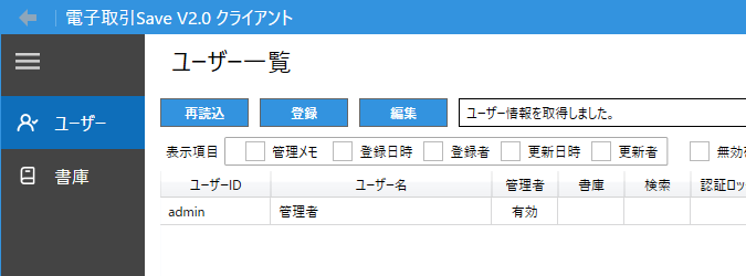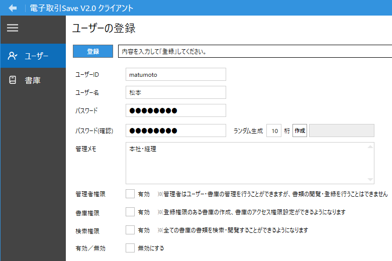 ユーザー一覧の画面の「登録」ボタンから書類を操作・保存作業を行うユーザーを作成します。