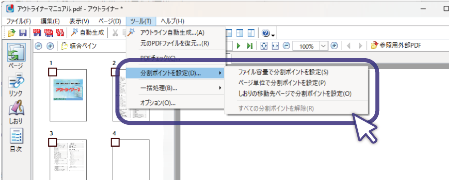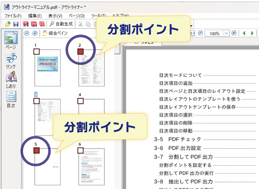 アウトライナーは指定した分割ポイントでPDFを分割できます。