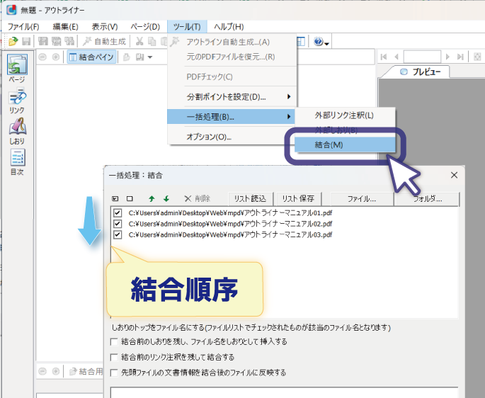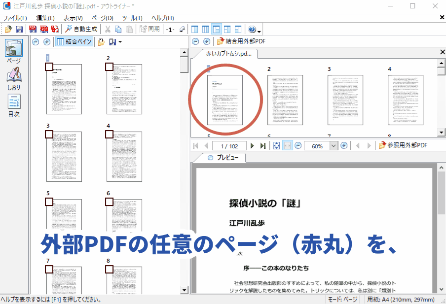 アウトライナーは複数のPDFを1つに結合するだけでなく、PDFの指定したページを他のPDFに挿入できます。