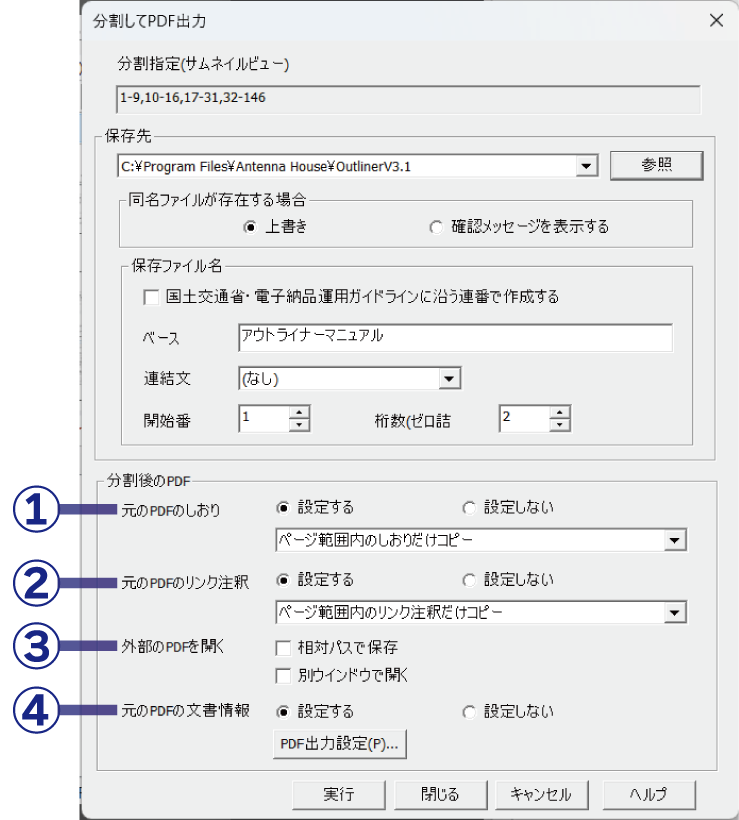 PDFの分割・抽出時には、出力結果のPDFに対するしおり・リンク注釈などの設定が行えます。