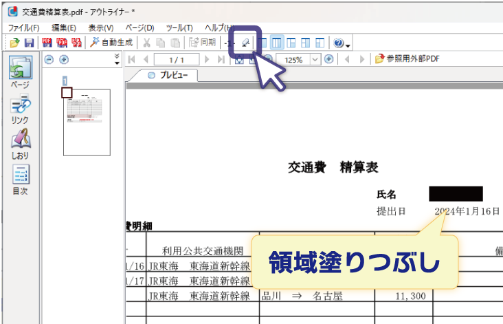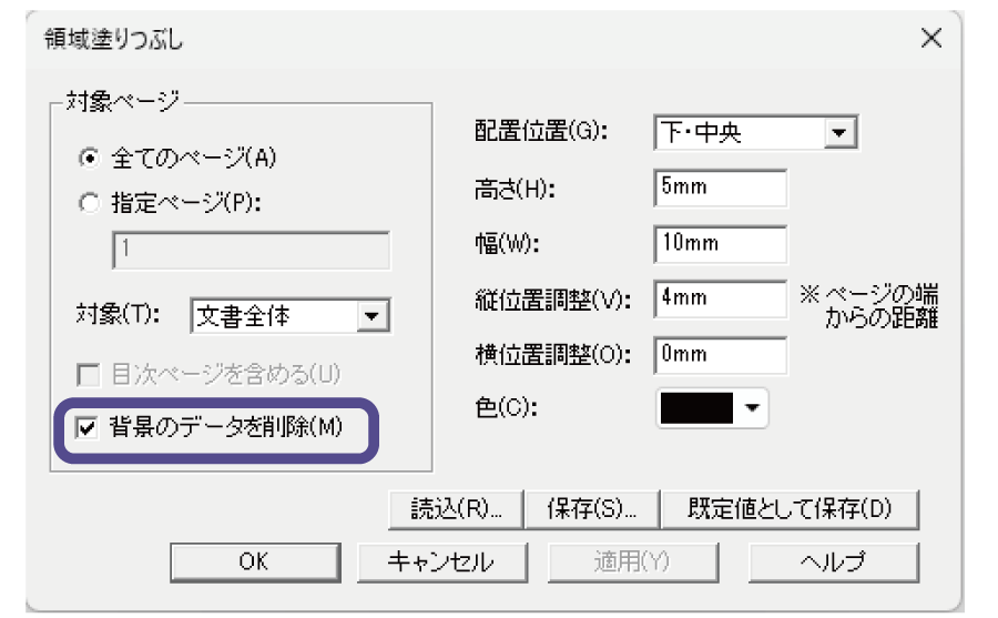 PDFのページ上で矩形選択した部分に対して、領域塗りつぶしと墨消し設定ができます。