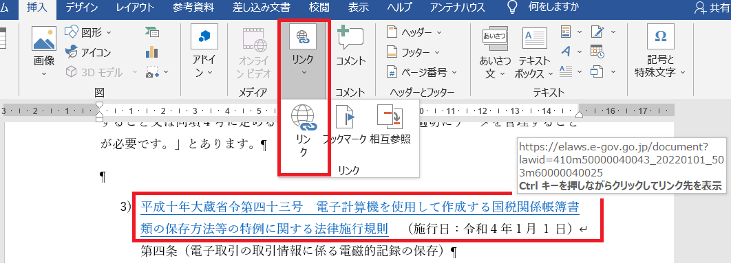 次はWordの編集画面で外部URLへのリンクを設定した例です。