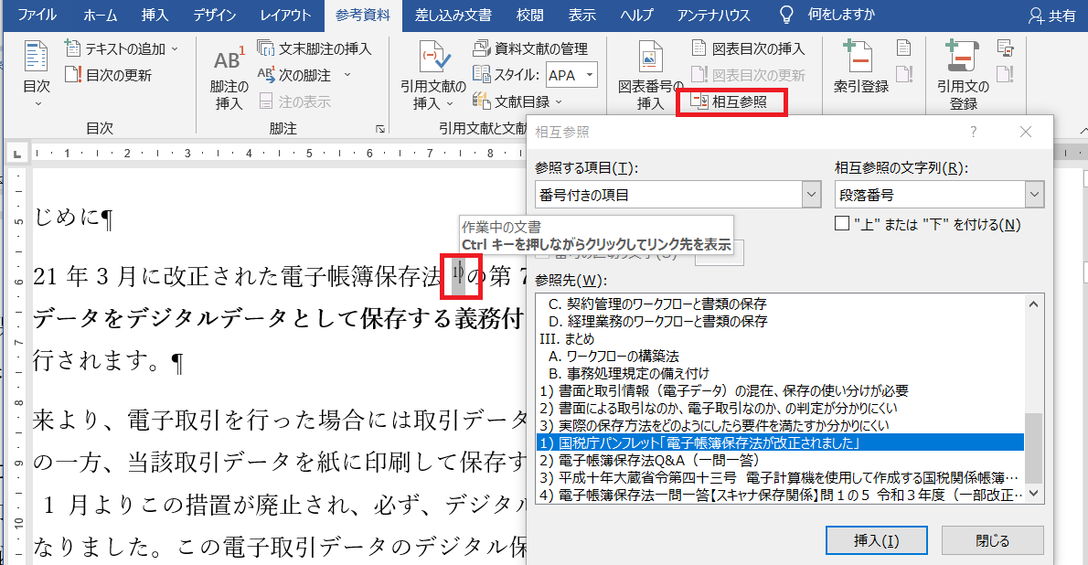 「相互参照」ボタンは、文書内でカーソルを置いた位置から、文書内部へのリンクを設定します。「相互参照」ダイアログリンク先を「参照する項目」から選択します。