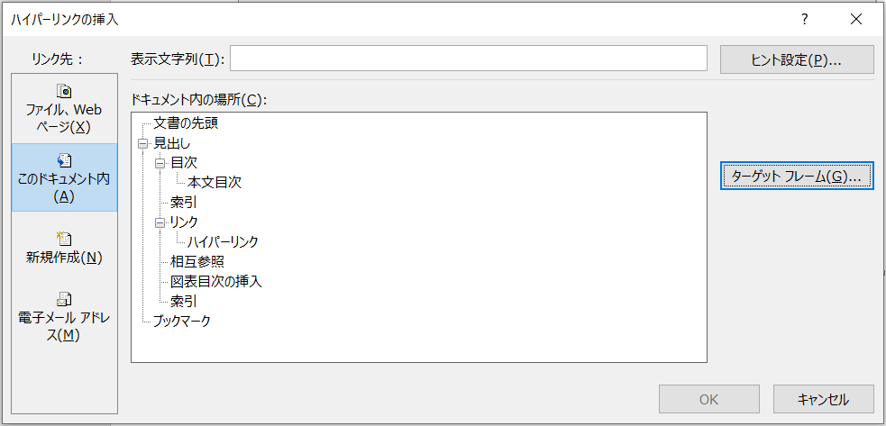 一方、目次作成、図表目次の挿入、リンク貼り付けおよび相互参照を設定するとターゲット位置(リンク先)にブックマークが自動的に作成されます。
