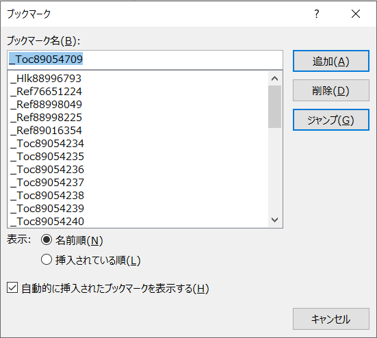 目次作成と図表目次で自動的に作られたブックマークは 「_Toc」で始まる数字、リンク貼り付けで自動的に作られたブックマークは「_Hlk」で始まる数字、相互参照で自動的に作られたブックマークは「_Ref」で始まる数字をもつ識別子です。