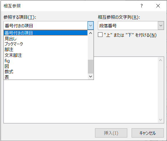 参照する項目は、アウトライン番号や段落番号を付けた項目、見出し、ブックマーク、脚注、図、表など多岐にわたります。また、表示文字列は参照する項目毎にカテゴリー化されていて、そのカテゴリーから選択します。「リンク」とは違ってカテゴリー化されているので文書全体で統一しやすくなります。なお、「相互参照」は、リボン「参考資料」の「図表」グループからも使えます。