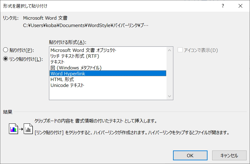 リンク貼り付けでは貼り付ける形式を選択できますが、Word Hyperlinkを選択すると貼り付けた箇所からコピー元の位置をターゲットとするリンクを設定できます。ターゲット位置の前に「_Hlk」から始まる数字を含むブックマークが自動的に設定されます。
