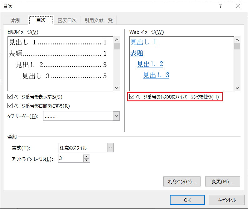 目次の自動作成では、段落のアウトラインレベルが設定された項目を集めて目次を作成します。そして、目次の各項目と図表目次の項目に、見出しや図表のキャプションにジャンプする、ハイパーリンクが設定されます。