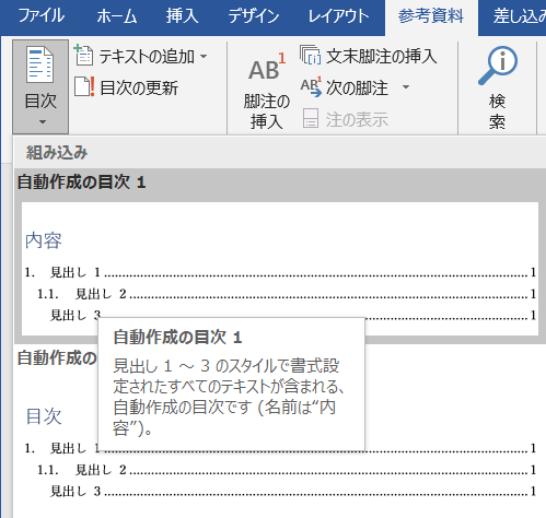目次自動生成機能は、見出しスタイルの機能の一部として紹介されることが多いが、アウトラインレベルを設定した段落を集めて目次を作るものです。既定値ではアウトラインレベル3まで、オプションでレベルを変更できます。なお、「見出しから目次を自動生成」も参照してください。