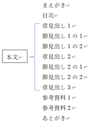 冊子本のような見出しを付けるには、本文は見出しスタイルにアウトライン番号を付け、前付け、後付けでは、見出しの段落に見出しスタイルではなく、アウトラインレベルのみを設定します。これにより、冊子本のような見出しの体裁と目次の自動生成ができます。