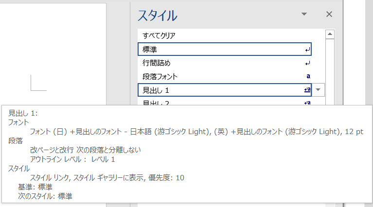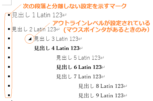 見出し1は文字サイズが大きく行の前後に空きがあります。見出しのレベルが下がるにしたがって、行頭のインデントが大きくなるなど、見出しのレベルで体裁が段階的に変わっています。共通点としてページの最後が見出しで終わらないように「続く段落と分離しない」設定になっています。また、マウスポインタを上に置くとアウトラインレベルが設定されているマークが表示されます。
