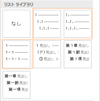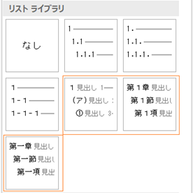 リストライブラリーには、① 階層化した番号のみのタイプと、② 番号の後ろに「見出し」という文字の入ったタイプの二つのタイプがあります。