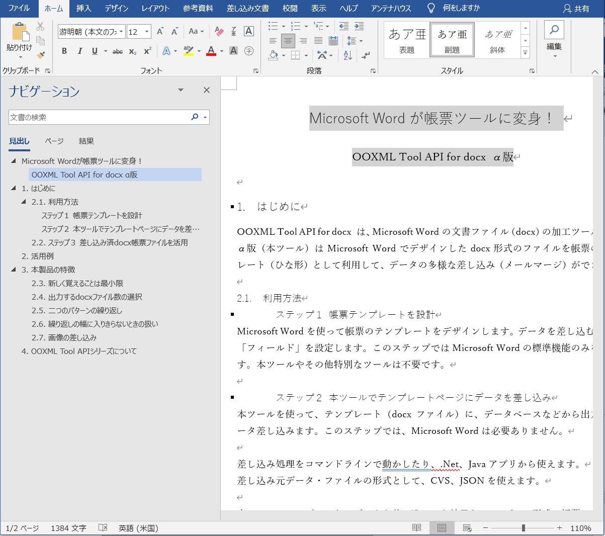 見出しスタイルを設定した段落はナビゲーション・ウィンドウに表示されます。次の例では表題と副題にアウトラインレベルが設定されているので、見出しの他に表題と副題もナビゲーションに表示されています。