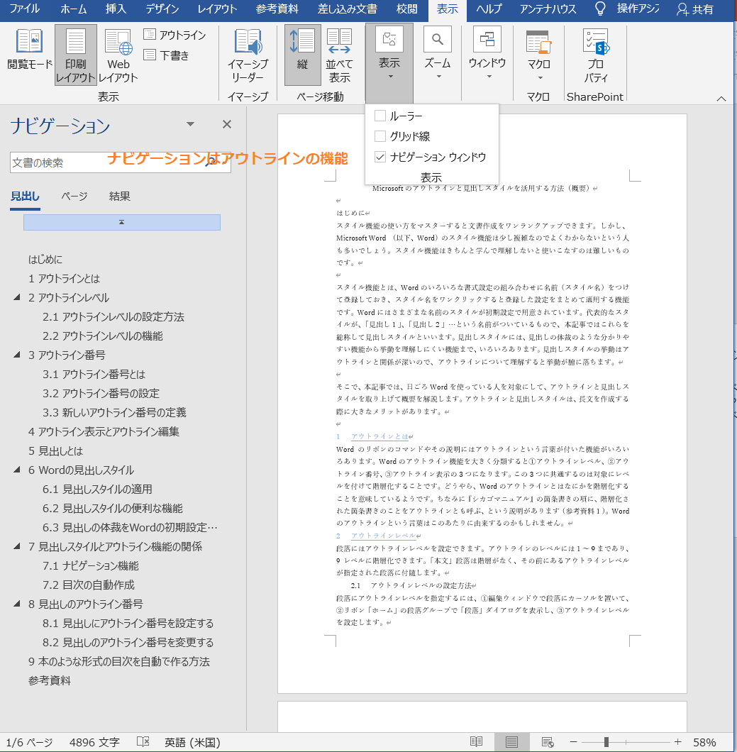 ナビゲーションは、見出しスタイルの機能の一部として紹介されることが多く、見出しスタイルの機能として理解している人も多いと思われます。しかし、ナビゲーションはアウトラインレベルの機能です。なお、「見出しでナビゲーション」も参照してください。