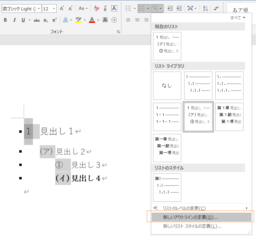 自分で見出しのアウトライン番号を作るには、既製の見出しのアウトライン番号を設定してから、それを変更するのが簡単で確実です。次にその方法を説明します。