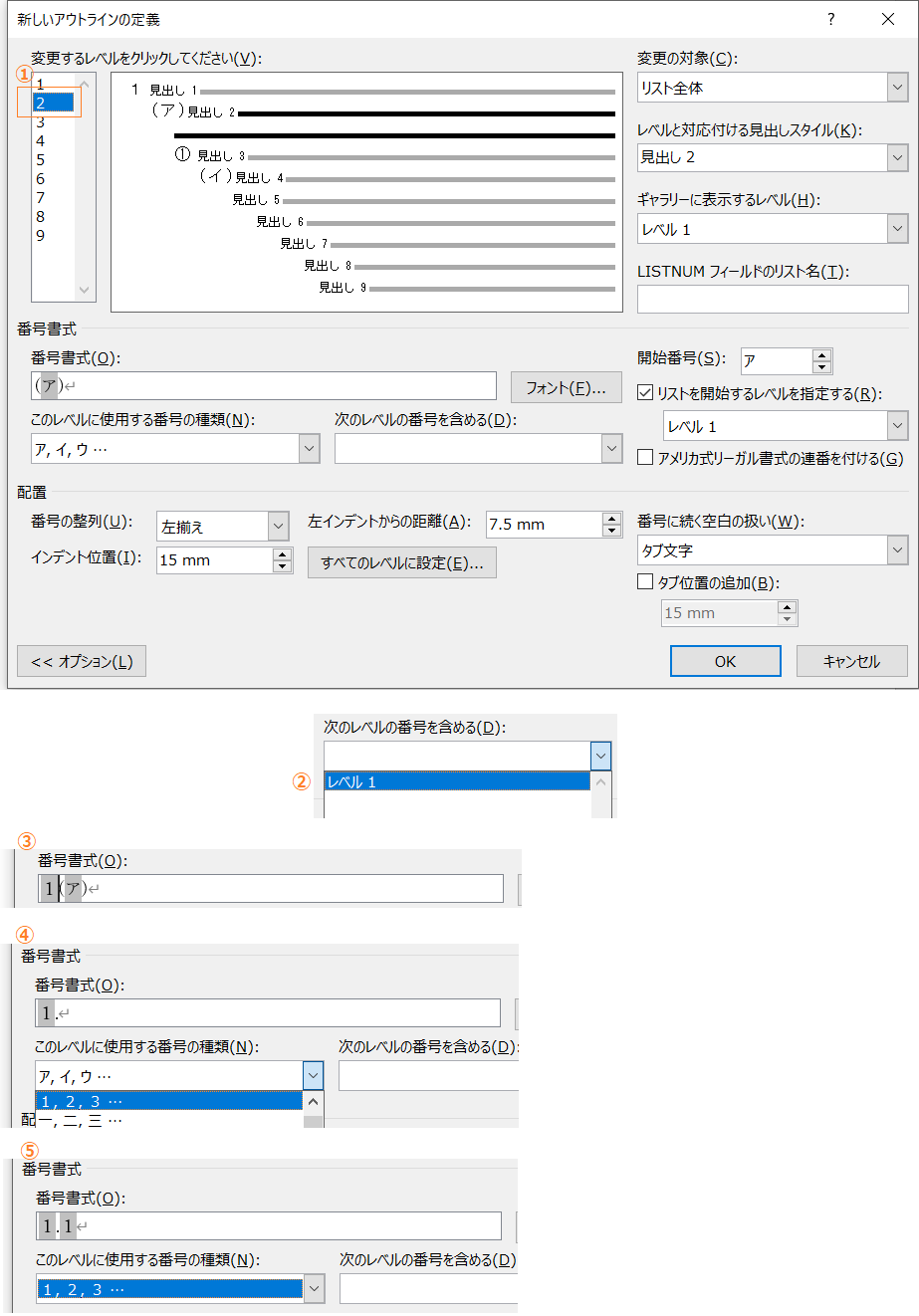 - (2)するとダイアログに設定状態が取り込まれます。そこでアウトライン番号を変更します。次図の例ではレベル2の番号書式を(ア)から「.1」に変更しています。
