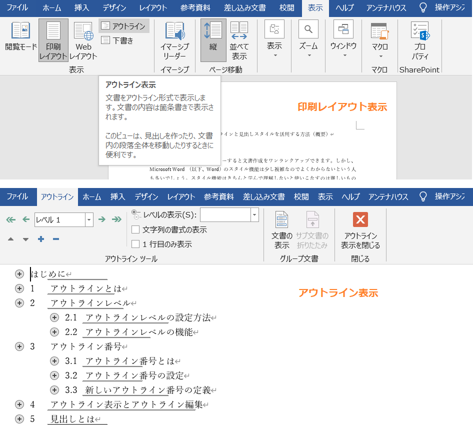 アウトライン表示とアウトライン編集