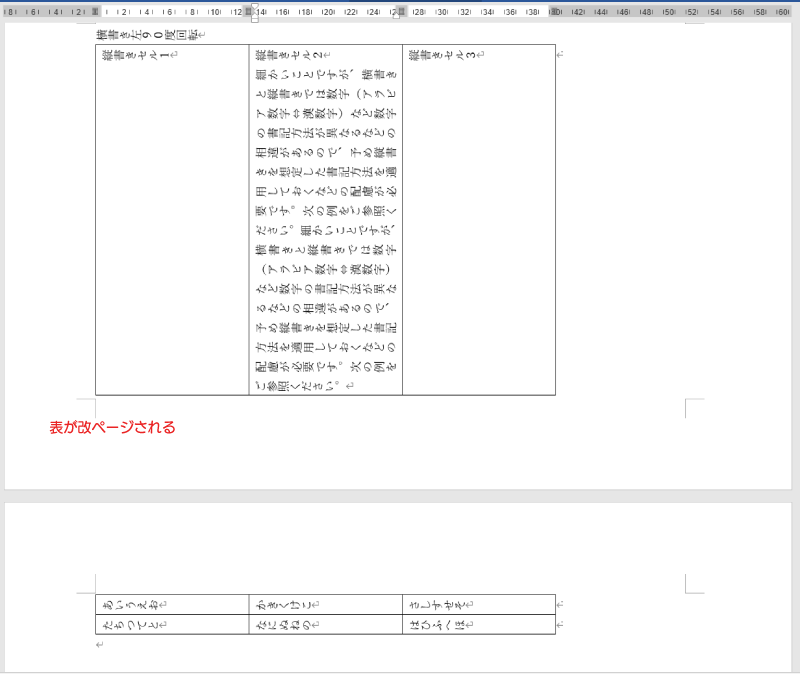 表のセルに文字を入力していき、表の高さが大きくなってページの区切りを超えた場合、ページをまたがっていることが確認できます。