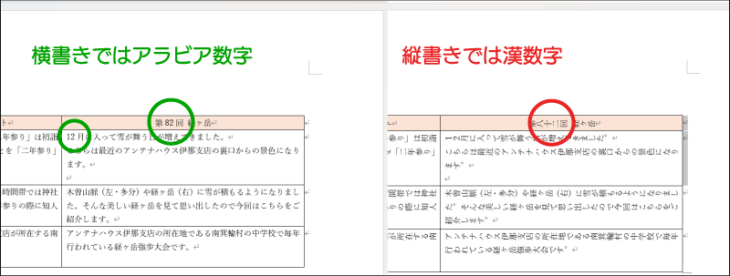 また、方法1と同様、数字の書記方法が異なるため、あらかじめ縦書きを想定した文書を用意しておく配慮が必要です。