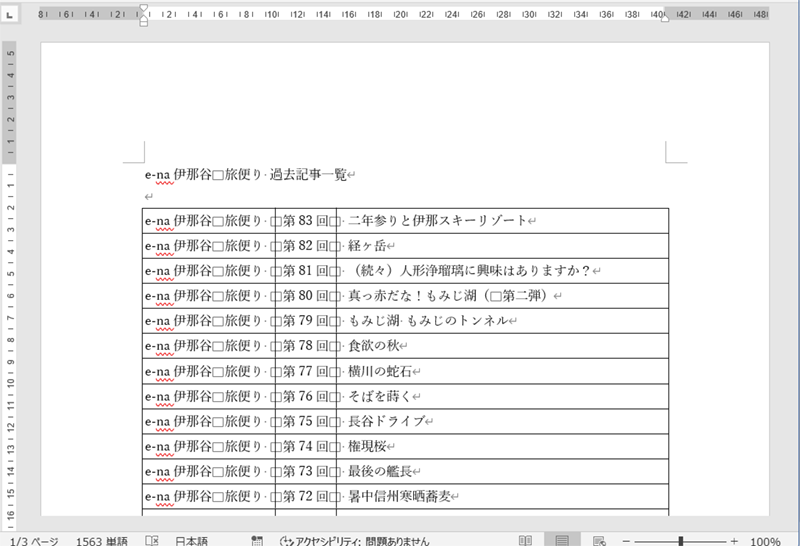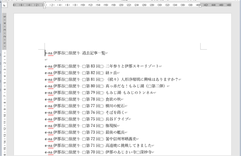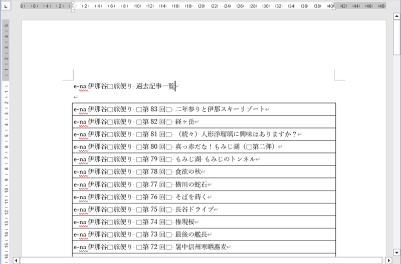 次のように項目が並んだ文書を罫線で区切った表の形式にしてみます。