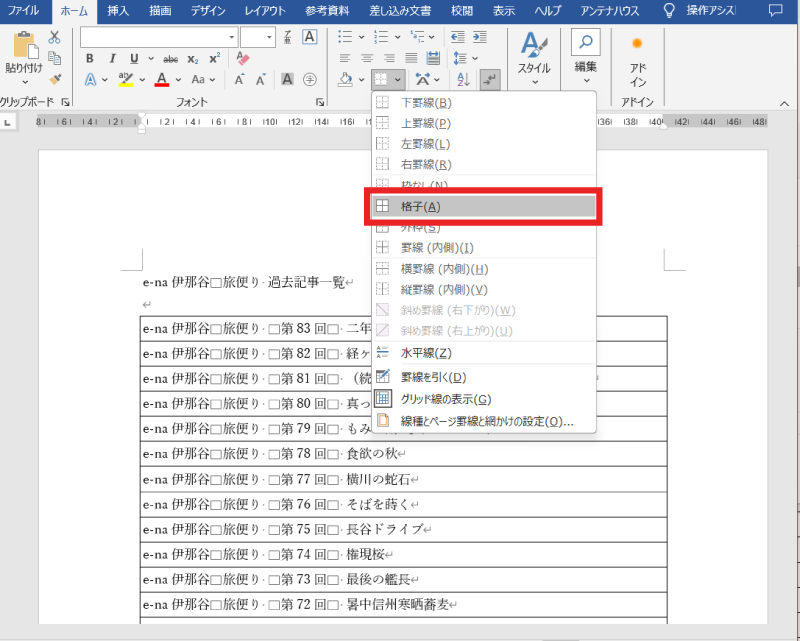 - まずは横組みの表形式を作成します。形式にしたい範囲を選択し、「ホーム」タブの「罫線」のメニューで「格子」をクリックします。