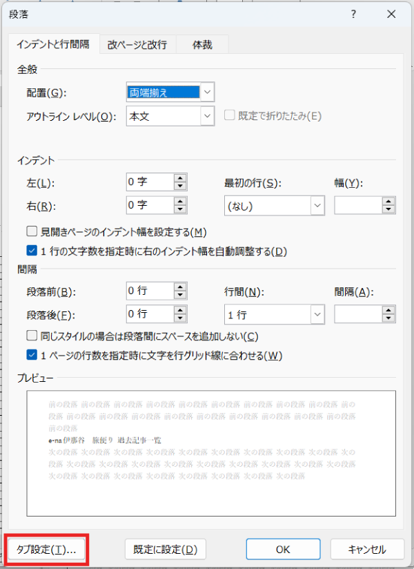 - 「段落」ダイアログの左下にある「タブ設定」ボタンをクリックします。
