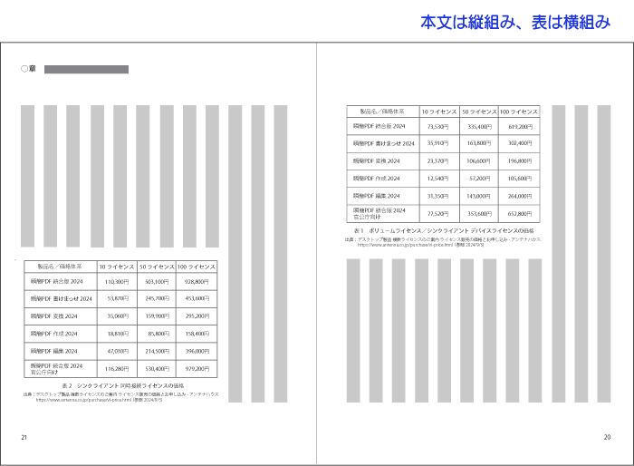 表の幅は版面幅以内にするのが原則ですが、横方向に広い表は見開きページに左右に分割して配置することも行われます。