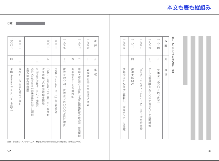 本文縦組みのとき、表を縦組みにする例としては年表などがあります。縦組みの表は、日本語組版でも例外的で、1ページをまるまる表にするなどの取扱いが多いようです。縦組みの表は例外的なレイアウトなのです。