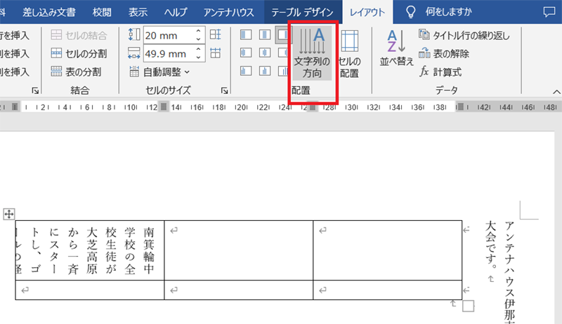 1つ目は、レイアウトの文字列の方向を変更して作成する方法です。