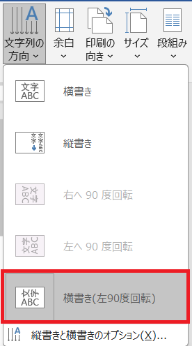 - 横書きの文書を作成した上で、「文字列の方向」を「左90度回転」に指定します。