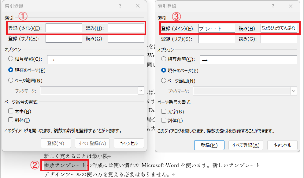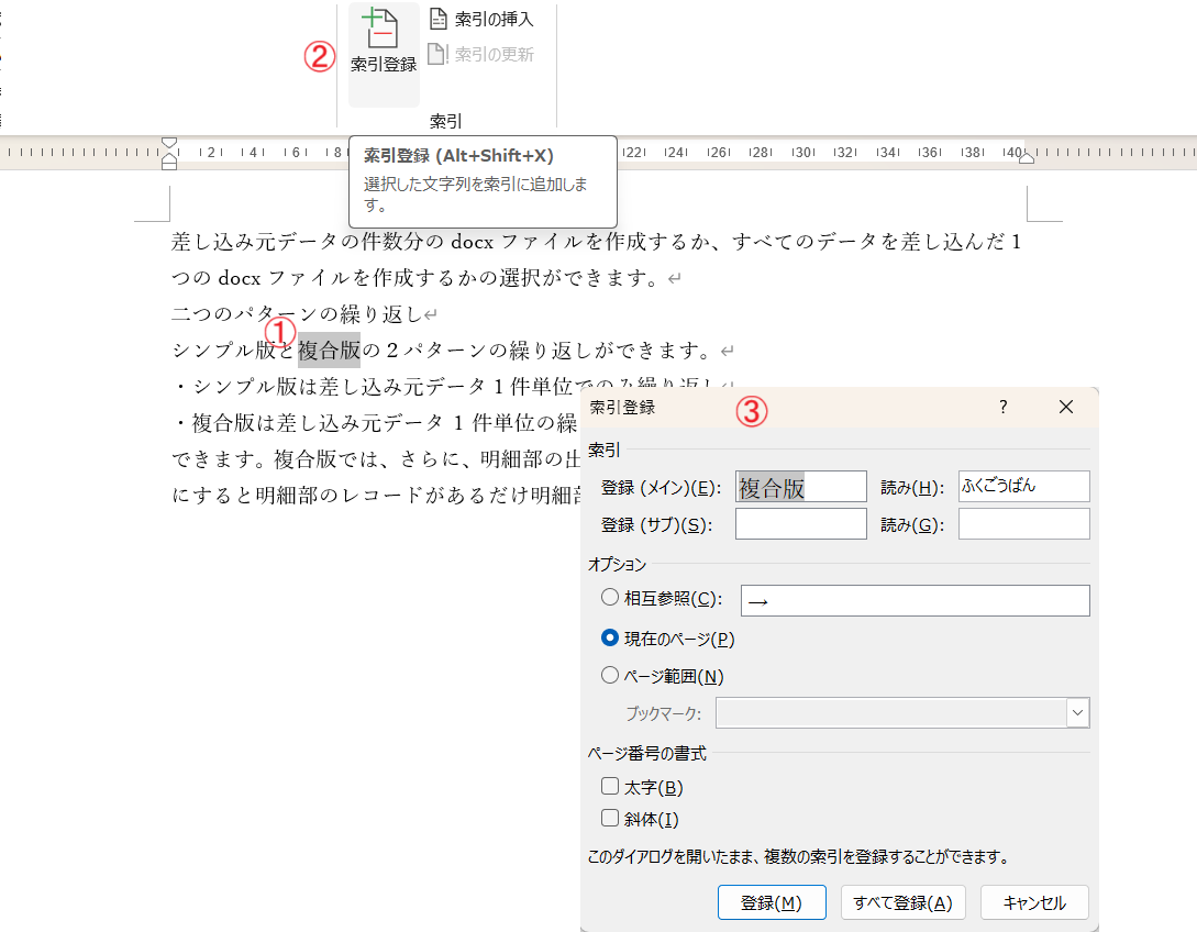 編集画面上で、索引項目にする文字列を選択(図①)します。その状態でリボンの「索引登録」ボタン(図②)をクリックすると、「登録」フィールドに索引項目が、「読み」フィ―ルドにそのよみがなを取り込んだ状態で登録ダイアログ(図③)が開きます。