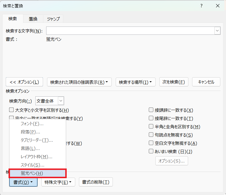 - リボン「ホーム」から「検索と置換」ダイアログを開き、検索条件「書式」の「蛍光ペン」を指定し、蛍光ペンを1回検索して検索ボックスを閉じる