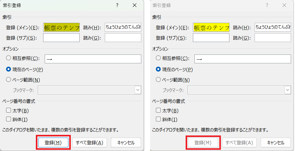 また、索引登録ダイアログの「登録」ボタンをクリックする代わりにキーボードで、[ALT]+[M]キーを同時に押すか、[Enter]キーを押す方法が使えます。このキーは上図の右のように「登録」ボタンが有効な状態になっているときに有効なので注意してください。