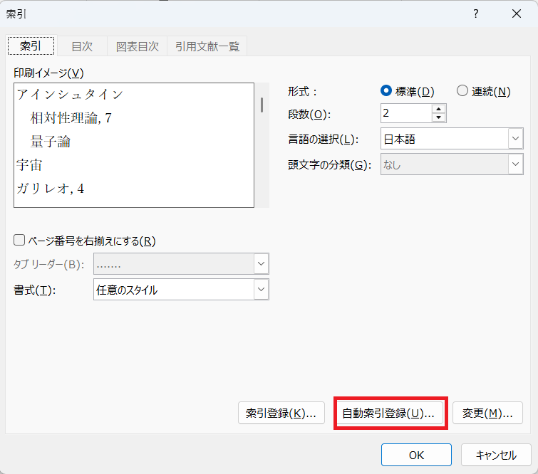 索引ダイアログ(リボン「参考資料」の「索引の挿入」で開く)の自動索引登録ボタン(図)で索引項目を一括登録できます。