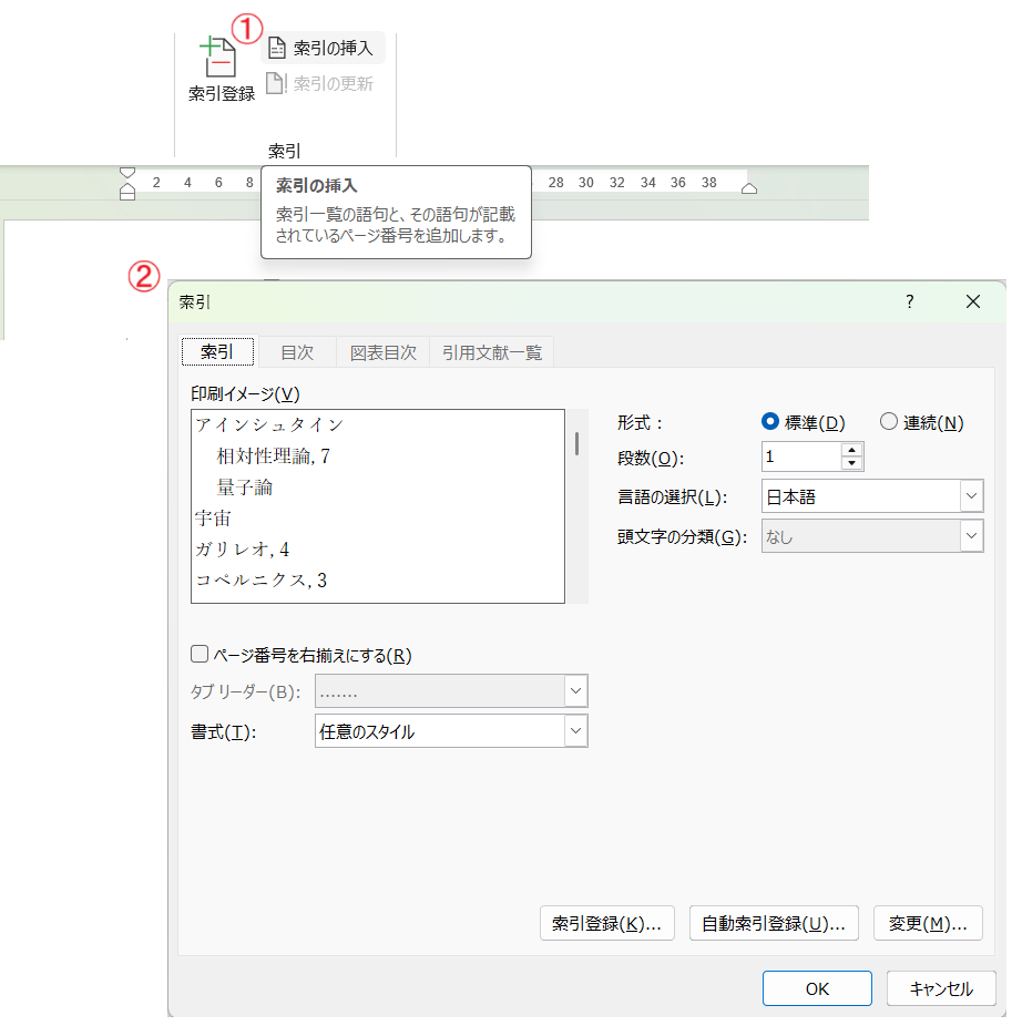 索引ページの作成は、索引ページを挿入する場所にカーソルを置いてから、リボン「参考資料」の「索引の挿入」ボタン(次の図①)をクリックします。すると索引ダイアログ(図②)が表示されるので、必要ならオプションを選択して「OK」をクリックします。