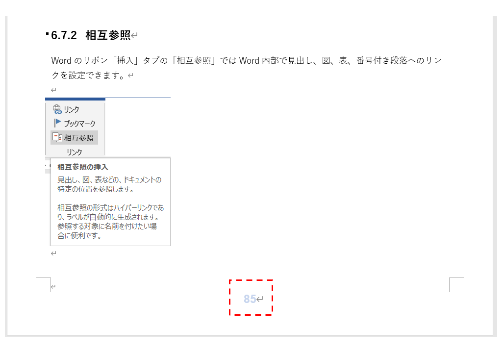 上の索引ページを見ると、例えば「相互参照」という項目(図の破線で囲った箇所)があり、そこに60と85という数字が付随しています。これは「相互参照」という項目は60ページと85ページに出てくることを意味しています。本文の85ページを開くと、次のように相互参照という用語がでています。