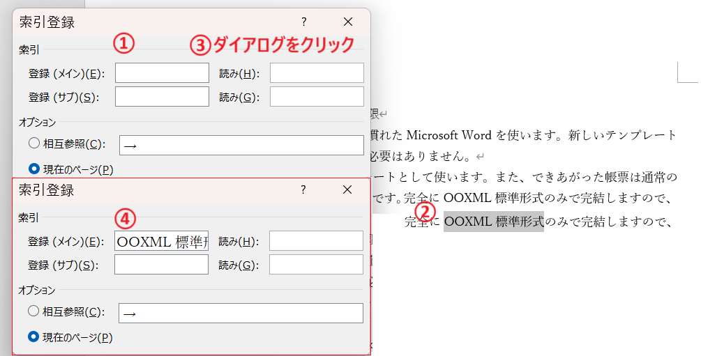 なお、索引登録ダイアログが開いている状態(図①)で、カーソルを編集画面に移して索引項目を選択して(図②)から、索引登録ダイアログをクリックする(図③)と、「登録」フィールドに選択した内容が取り込まれます(図④)。