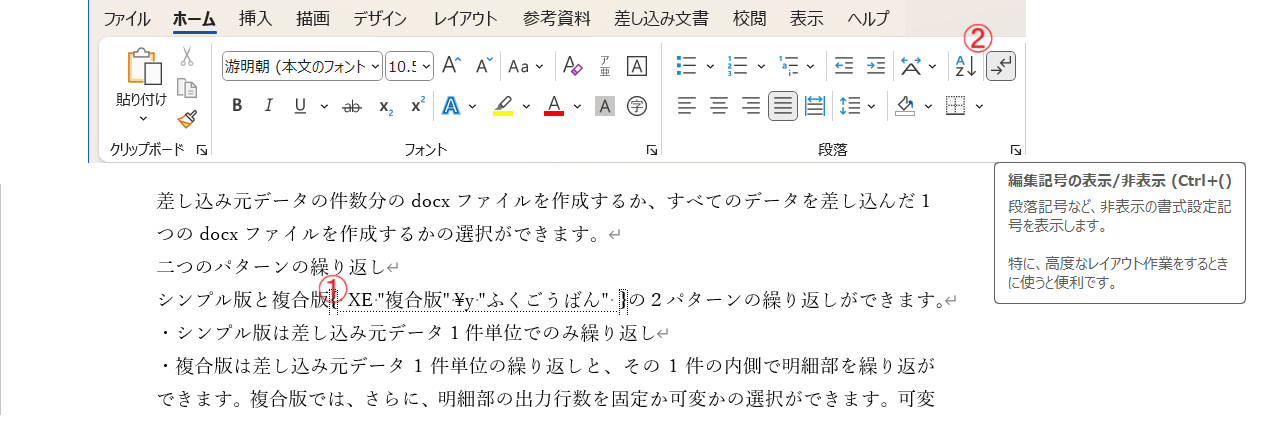 XEフィールドの表示と非表示を切り替えるには、リボン「ホーム」の段落グループにある「編集記号の表示/非表示」(図②)をクリックします。
