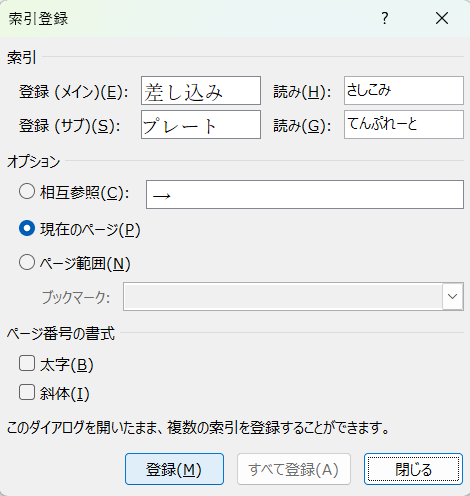 キーボードショートカットを使って連続登録する手順は次のようになります。最初の索引項目登録で索引登録ダイアログを開き、二つ目からはダイアログを開いたまま登録します。