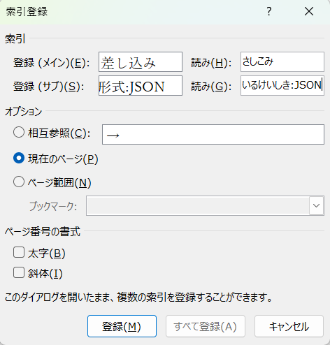 「索引」フィールドに同じ文字列が入力されていても、「読み」フィールドの文字が異なると、索引ページでは別の索引項目として扱われるのでご注意ください。