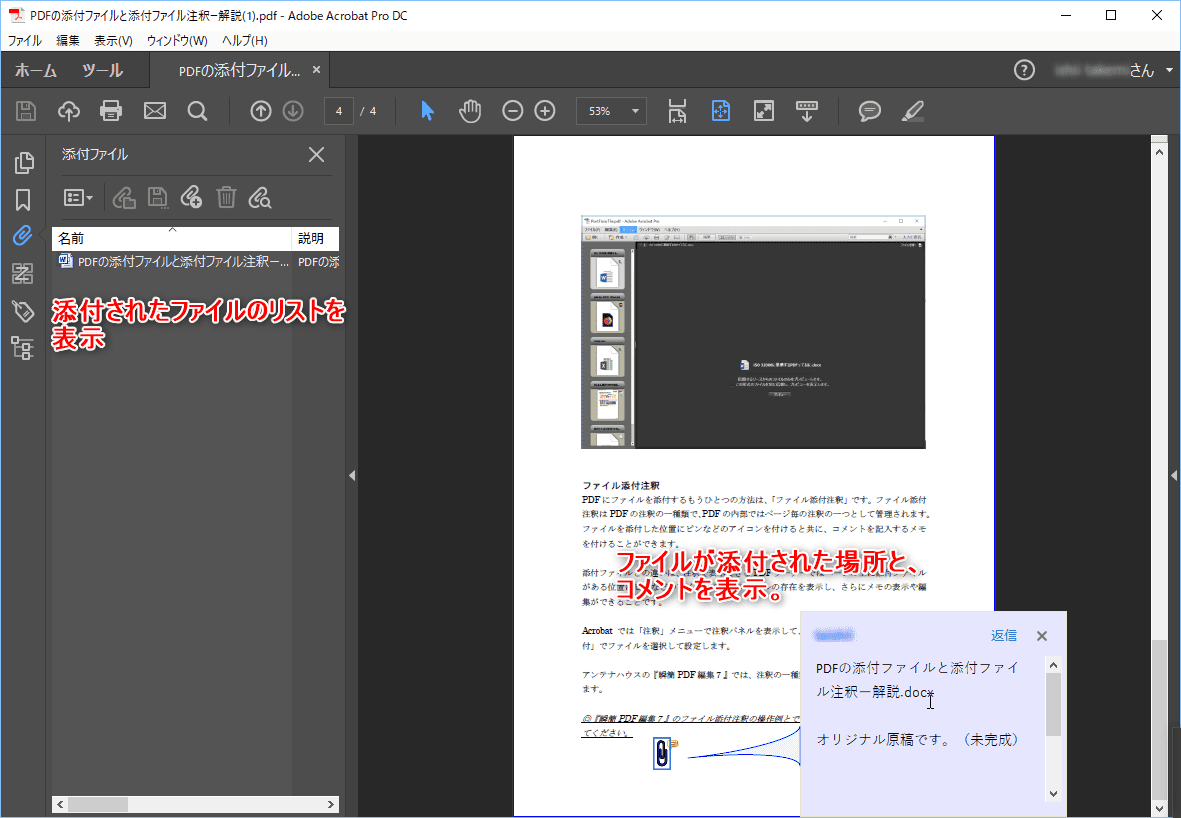 - PDF Reader で注釈内容を確認します。Acrobat Readerでは、左のクリップアイコンからPDFに添付されたファイルのリストを確認できます。プレビュー上では、クリップアイコンから、コメントと添付されたファイルを確認できます。