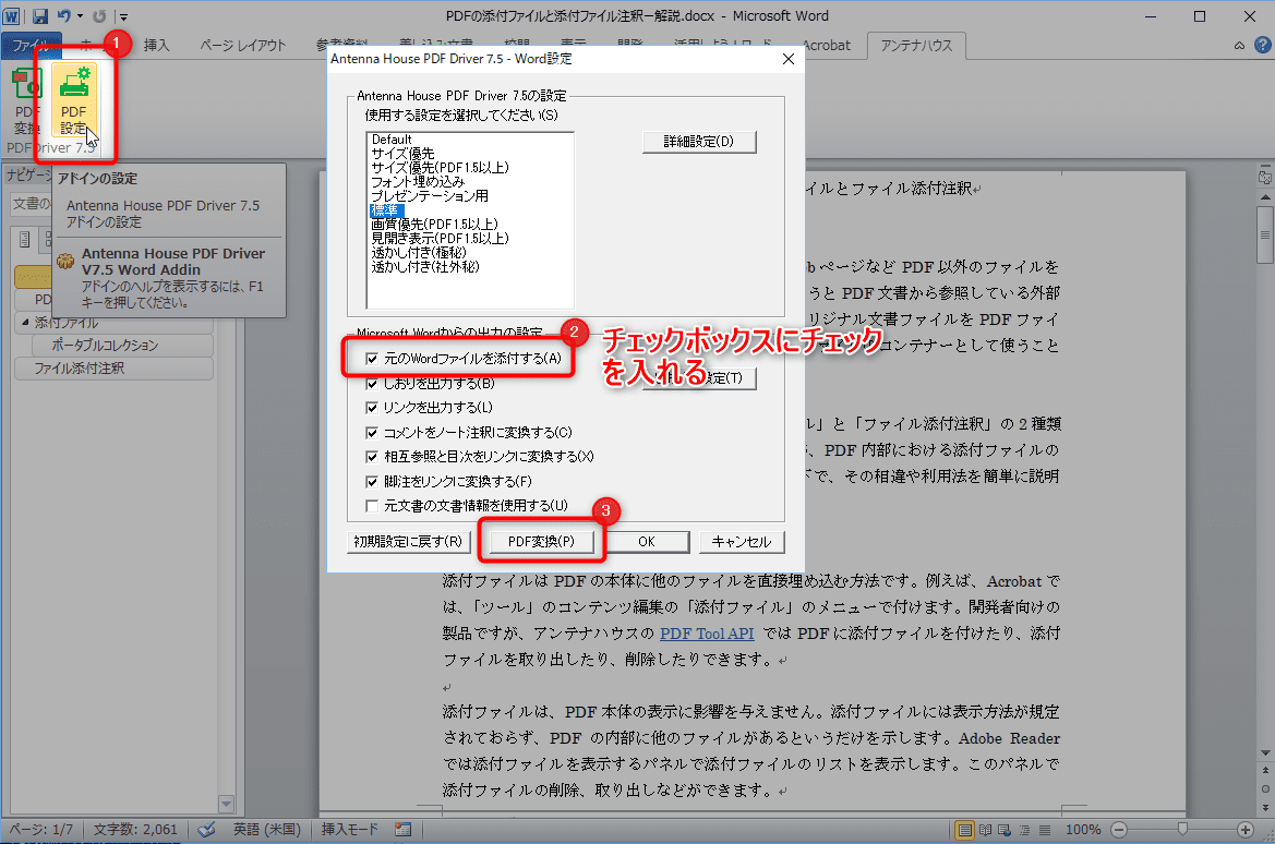 この他、『瞬簡PDF 編集』をインストールすると、一緒にインストールされる「Antenna House PDF Driver」のWordアドイン機能からも、WordファイルをPDFの添付ファイルとして設定できます。