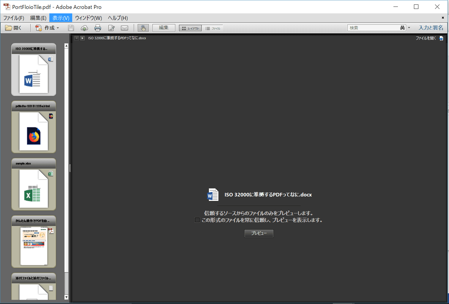 コレクション(ポートフォリオ)に対応するリーダーでは、作成したPDFに添付されているファイルをアイコンで表示するとともにそのプレビューの表示ができます。