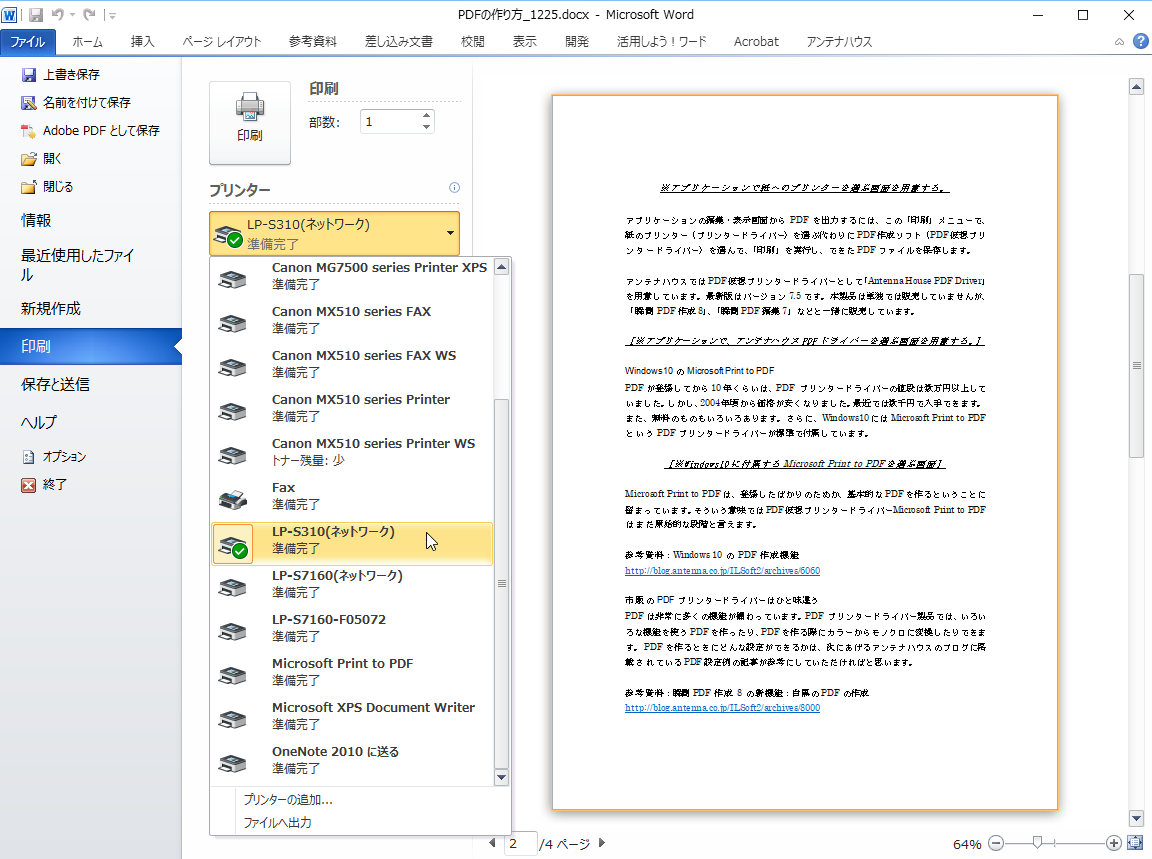 アプリケーションで、アンテナハウスPDFドライバーを選ぶ画面