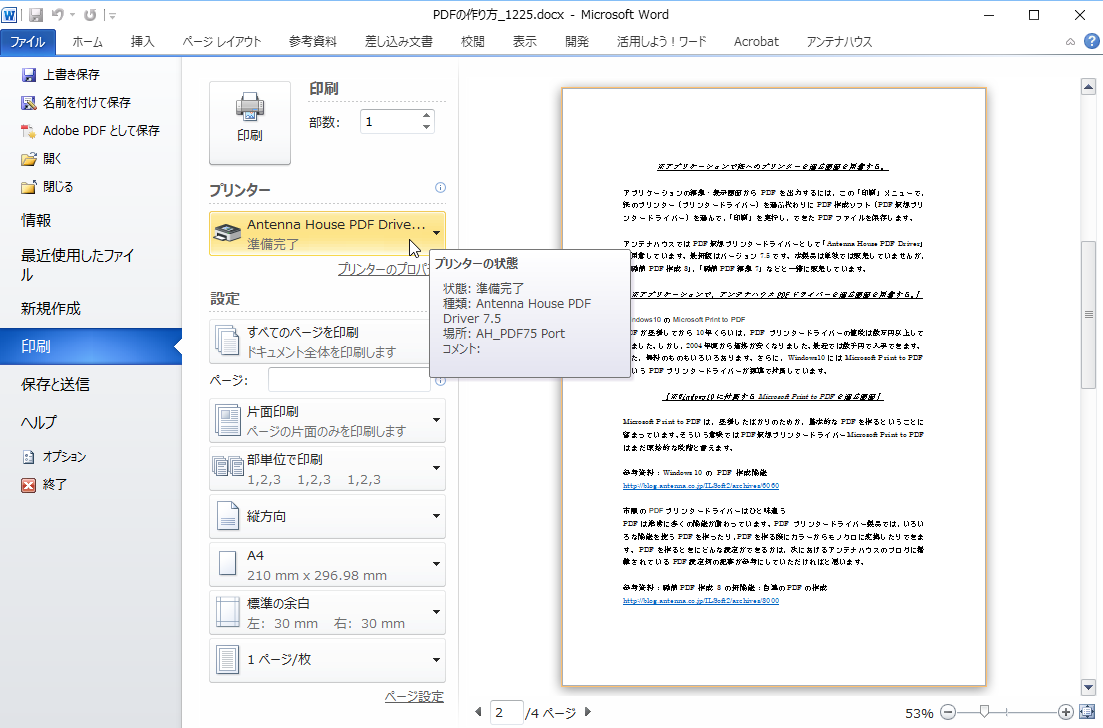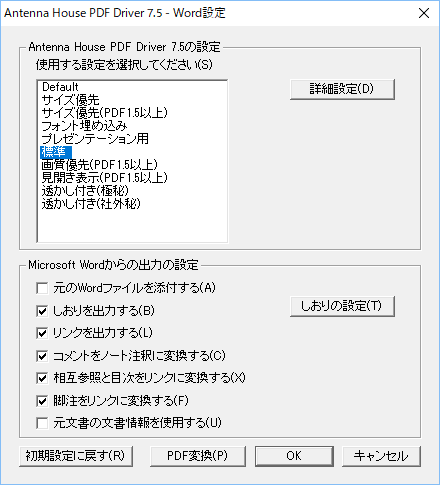 PDFを作るときにどんな設定ができるかは、次にあげるアンテナハウスのブログに掲載されているPDF設定例の記事を参考にしてください。